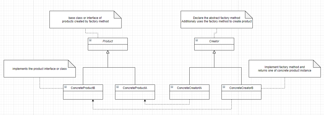 - The creator can be either concrete or abstract which provides a default implementation for the factory method. In concrete cases, you'll create some default object in base creator.