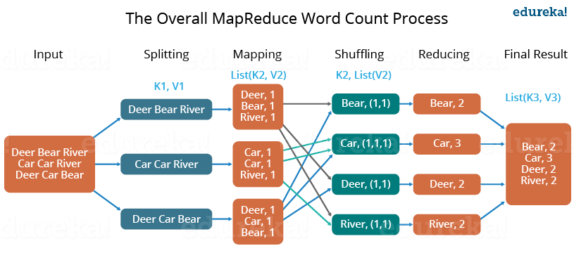 - Reduce task, which takes the output from a map as an input and combines those data tuples into a smaller set of tuples.