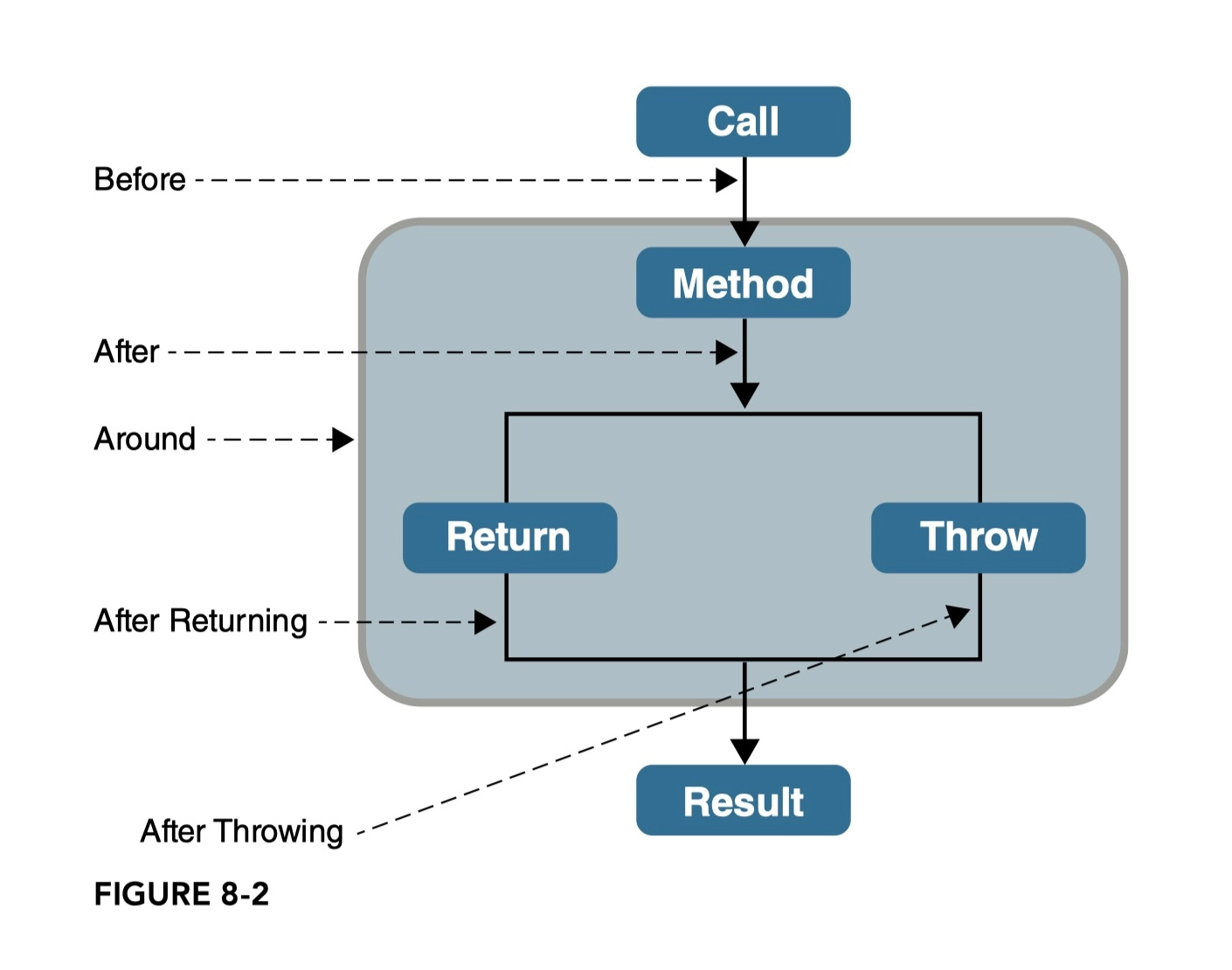 public interface EventService { void createEvent(); void publishEvent(); void deleteEvent(); }@Component public class SimpleEventService implements EventService { @Override public void createEvent() { try { Thread.sleep(1000); } catch(InterruptedException e) { e.printStackTrace(); } System.out.println("Created an event"); } @Override public void publishEvent() { try { Thread.sleep(1000); } catch (InterruptedException e){ e.printStackTrace();; } System.out.println("Published an event"); } public void deleteEvent() { System.out.println("Delete an event"); } }@Service public class AppRunner implements ApplicationRunner { @Autowired EventService eventService; @Override public void run(ApplicationArguments args) throws Exception { eventService.createEvent(); eventService.publishEvent(); eventService.deleteEvent(); } }Created an event 1003 Published an event 1000 Delete an event 0Also using @annotation PCD, you can weave specific join point as below. Only methods attached @PerLogging annotation are weaved with PerfAspect.