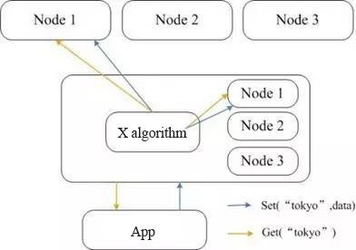 Memcached itself does not support distributed mode. You can only achieve the distributed storage of Memcached on the client-side through distributed algorithms such as Consistent Hash. The figure above demonstrates the distributed storage implementation schema of Memcached. Before the client side sends data to the Memcached cluster, it first calculates the target node of the data through the nested distributed algorithm that in turn directly sends the data to the node for storage. But when the client-side query the data, it also needs to calculate the node that serves as the location of the data queried, and then send the query request to the node directly to get the data.