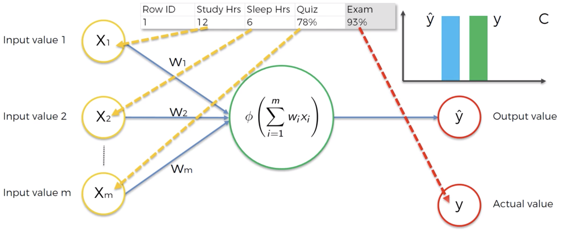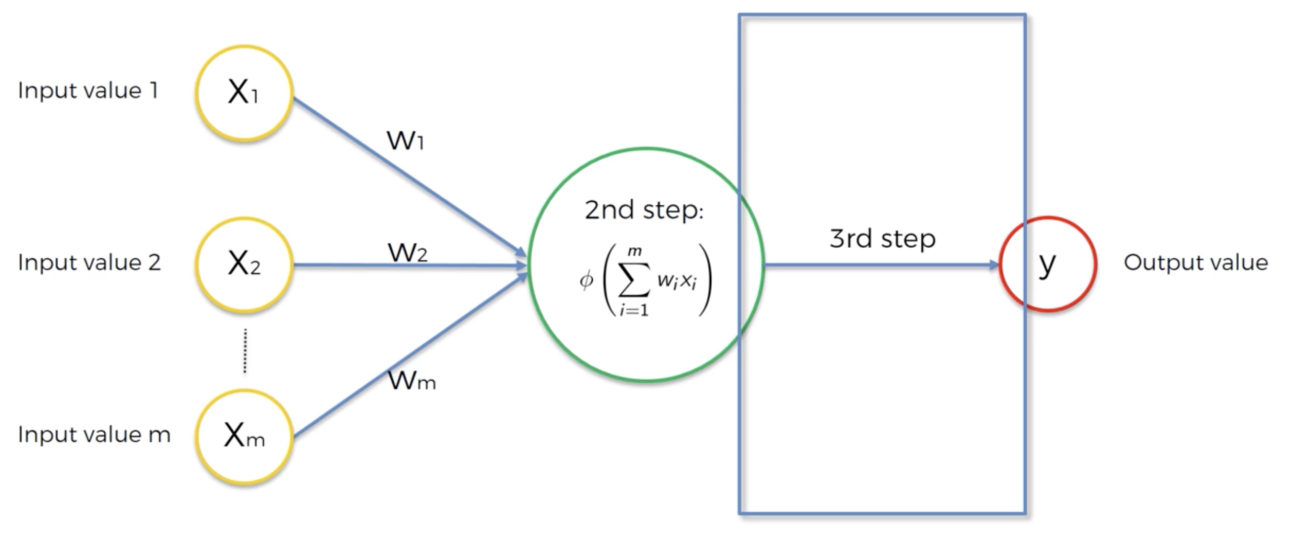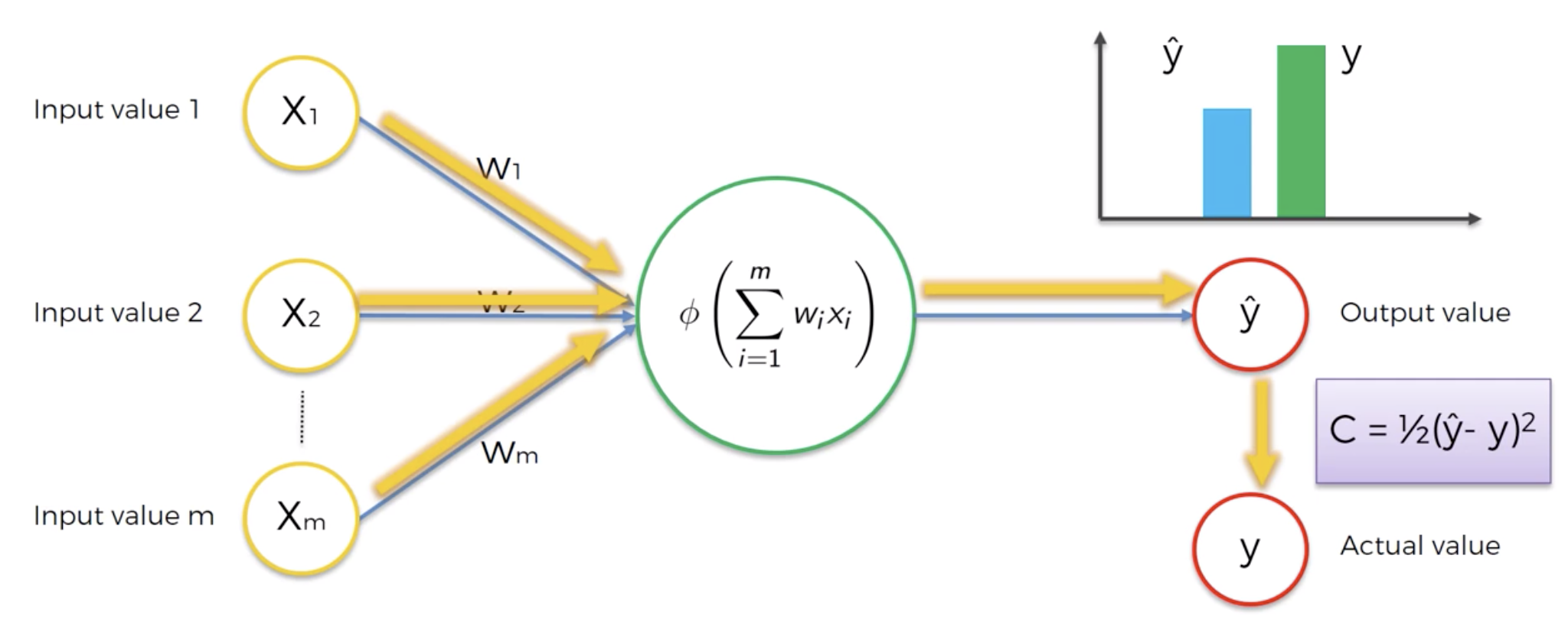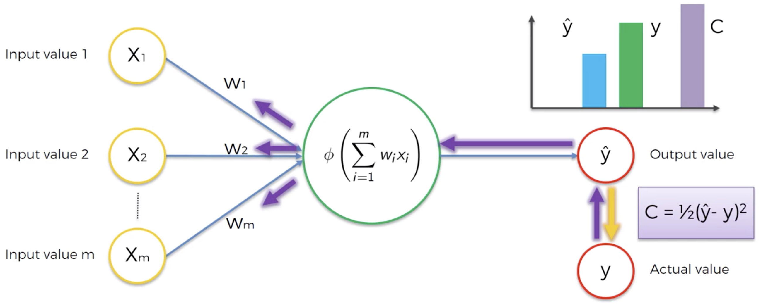 Step 4: Compare the predicted result to the actual result y. Measure the generated error.Step 5: Back-propagation: from right to left, the error is back-propagated. Update the weights according to how much they are responsible for the error. The learning rate decides by how much we update the weights.
