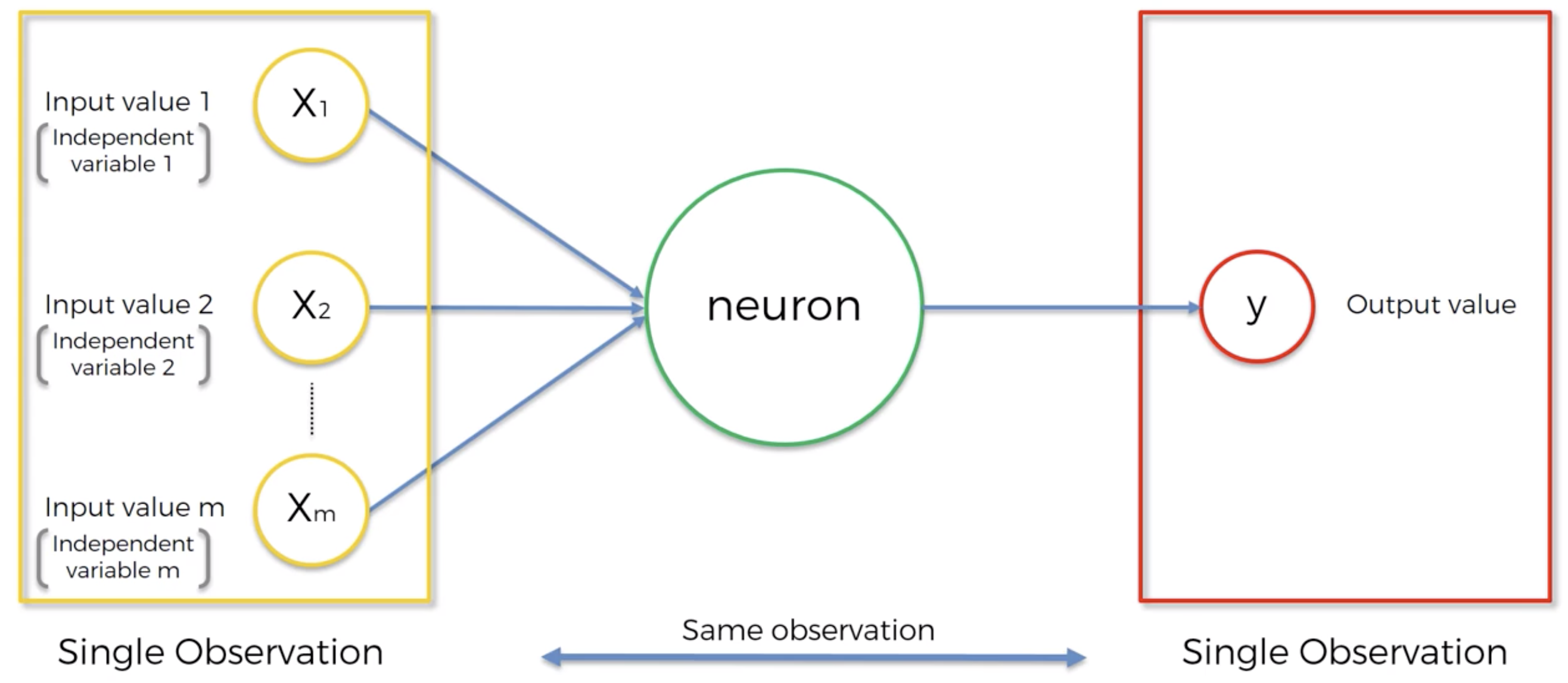 Step 2: Input the first observation of your dataset in the input layer. each feature in one input node.