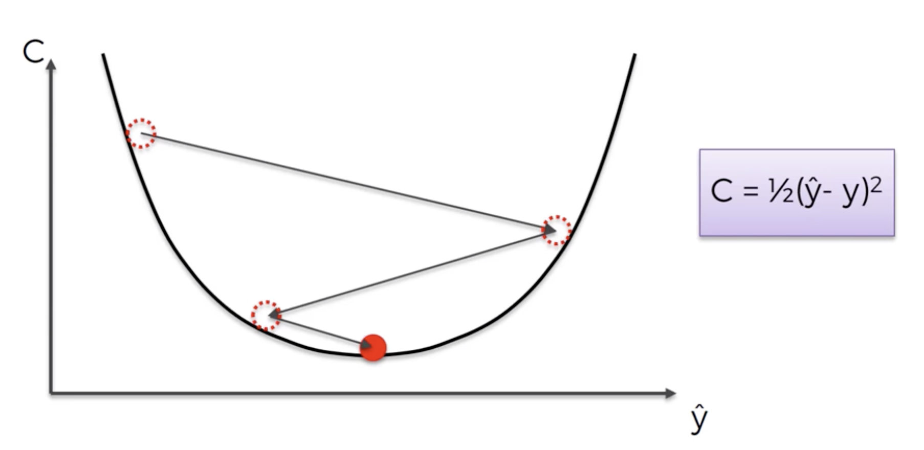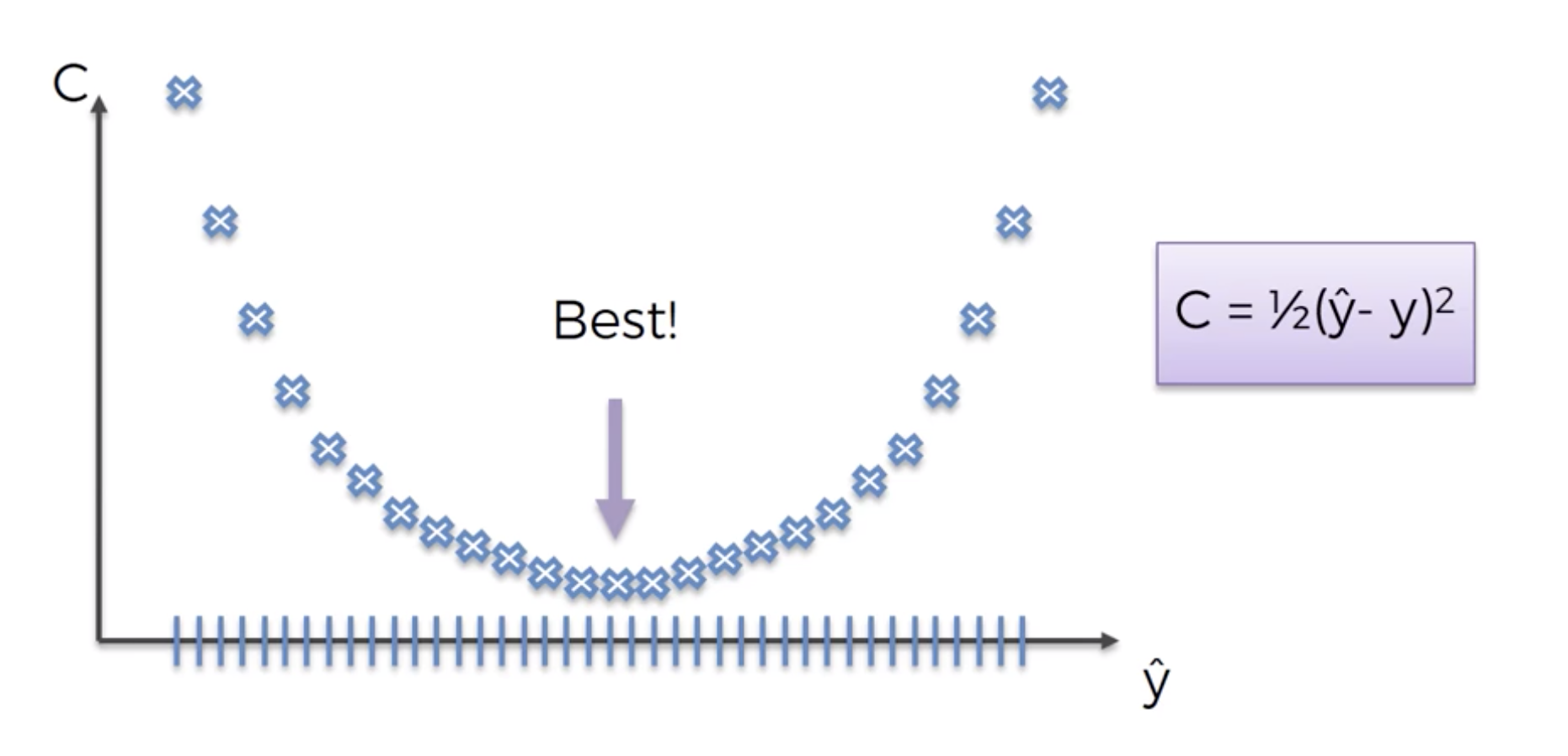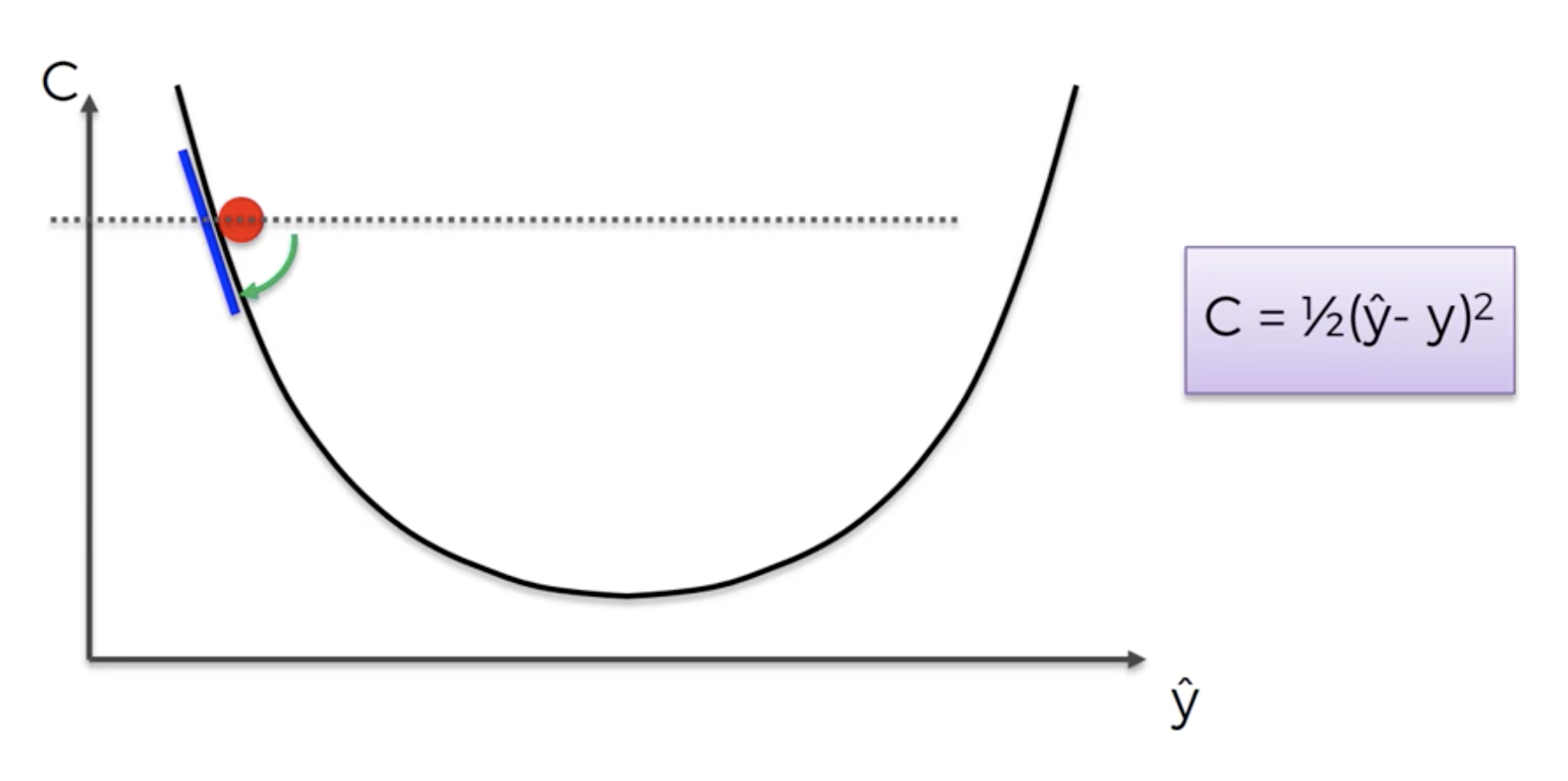 What is the error that you have in your prediction and our goal is to minimize the cost function because the lower cost function the closer the $\hat{y}$ is to y.