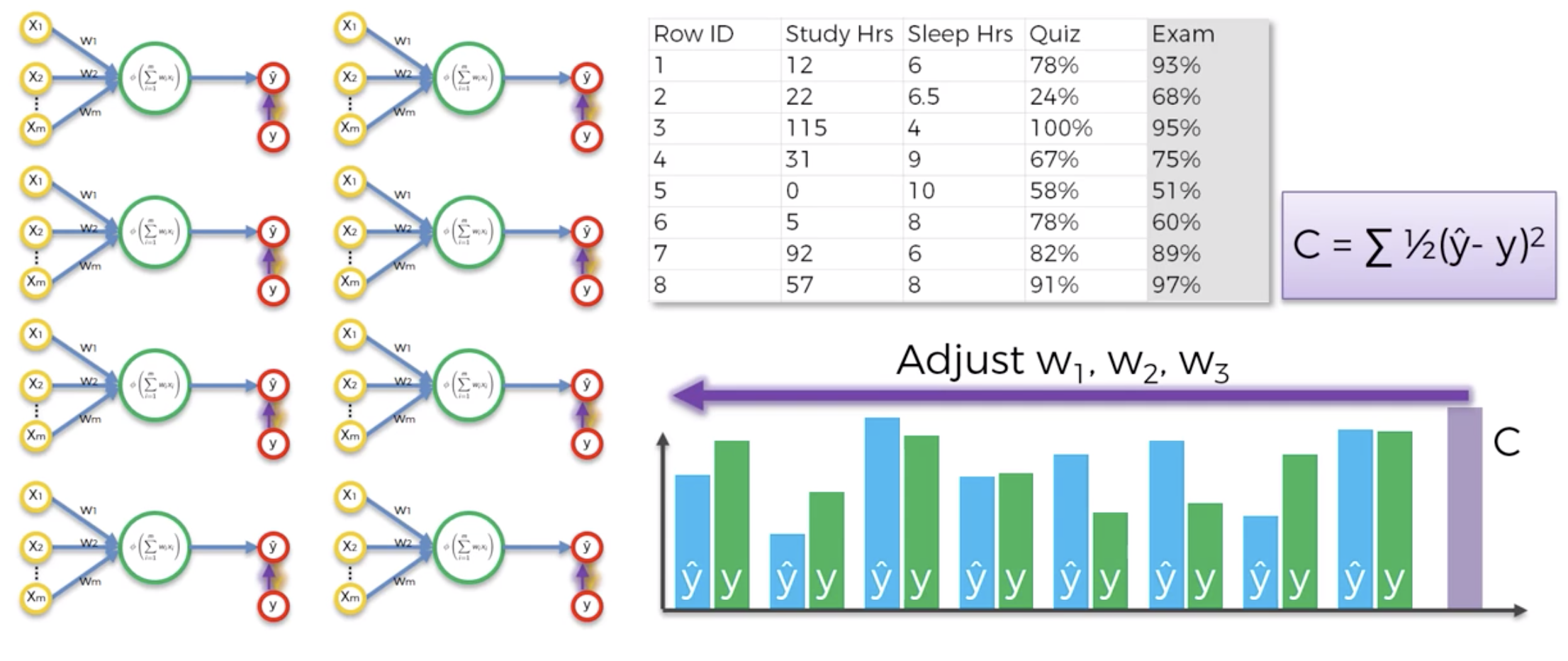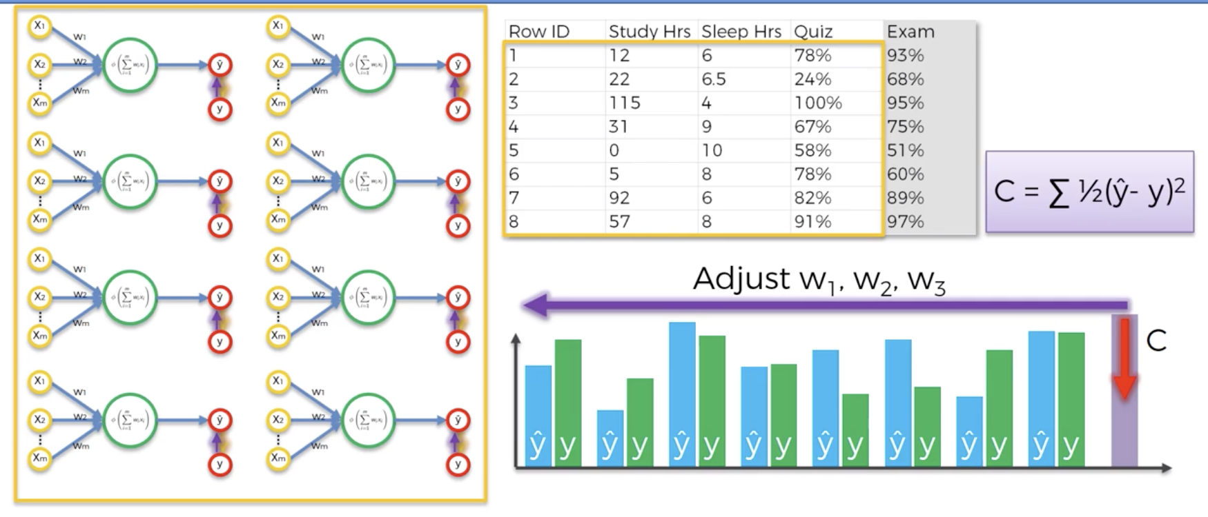 Once comparing the $\hat{y}$ and y, now going to feed this information back into the neural network and goes to weights and the weights get updated. In this scenario, The only thing to control is weights.