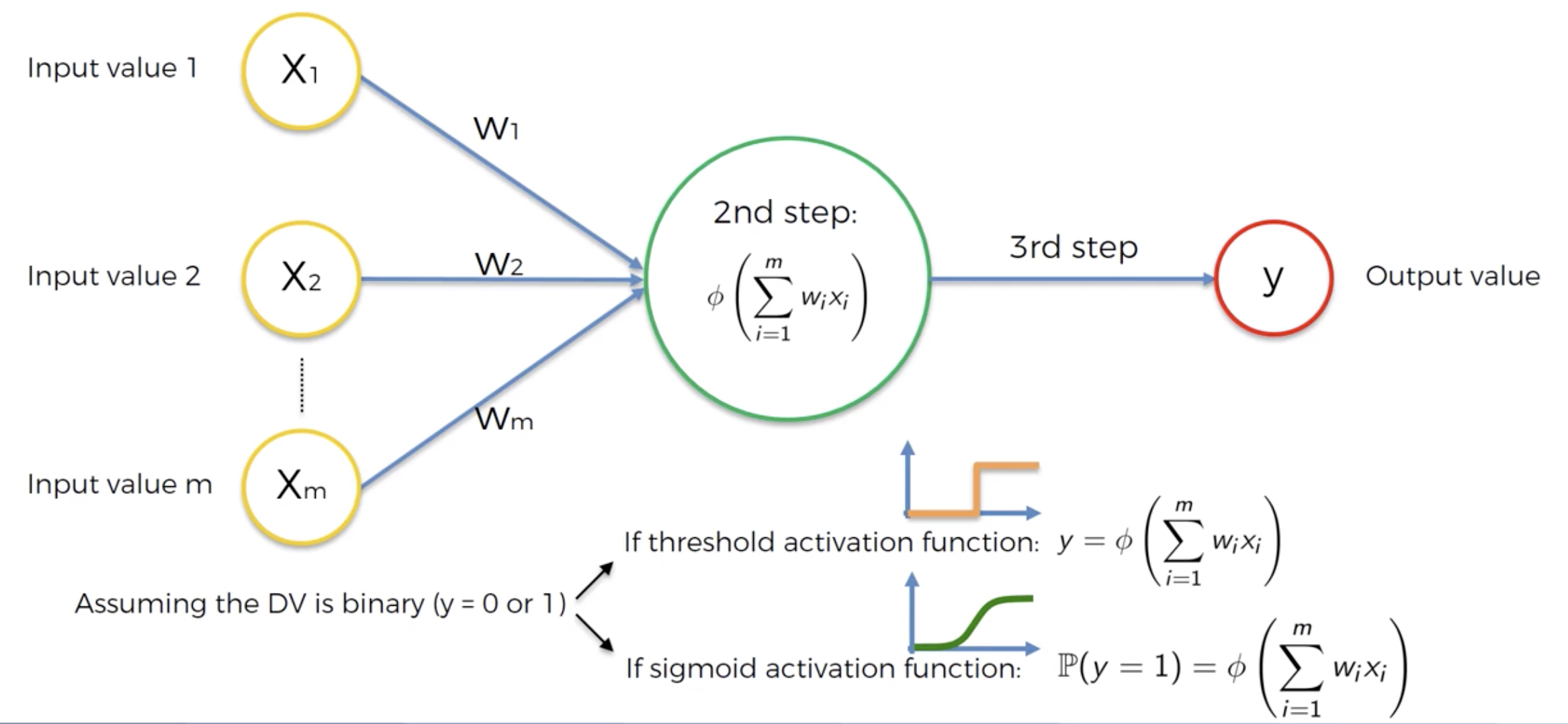 Step 3: Forward-Propagation: from left to right, the neurons are activated in a way that the impact of each neuron's activation is limited by the weights. Propage the activations until getting the predicted result $\hat{y}$