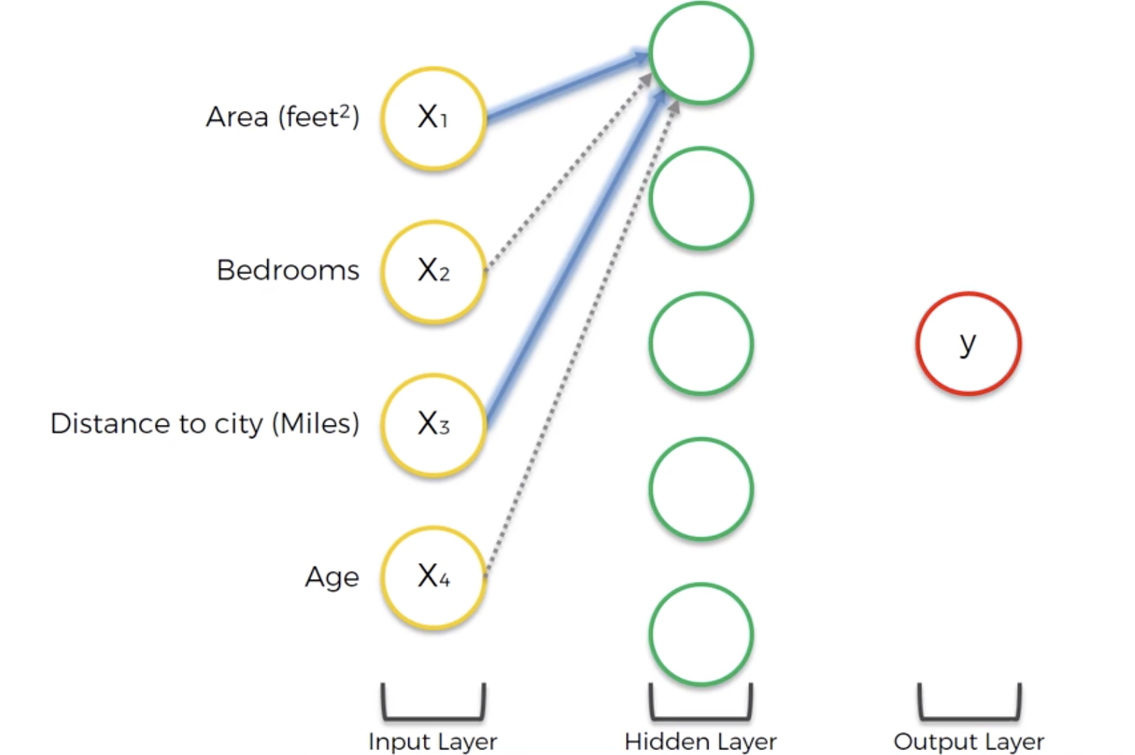 A neuron associated with Area and Distance to city, but not bedrooms and age for output price.