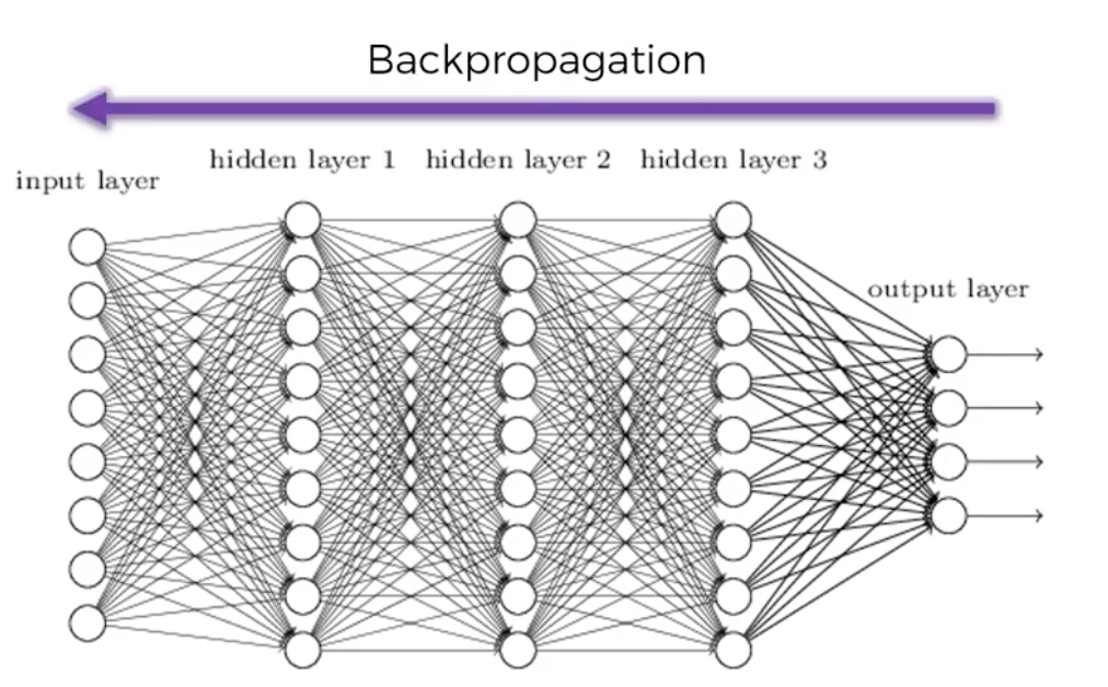 The errors are back-propagated through the network in the opposite direction that allows to train the network by adjusting the weights. Backpropagation is an advanced algorithm driven by sophisticated mathematics which allows us to adjust the weights, all of them at the same time.