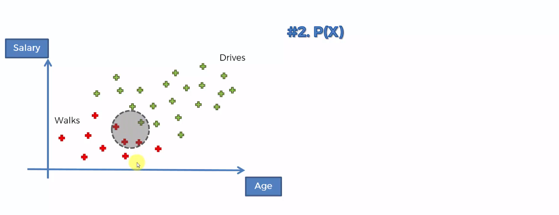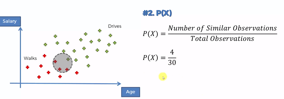 P(X) is the likelihood that a randomly selected point from this dataset will exhibit features similar to the data point that we are about to add. And as we agreed on anything in that circle is deemed to be similar to our data point.