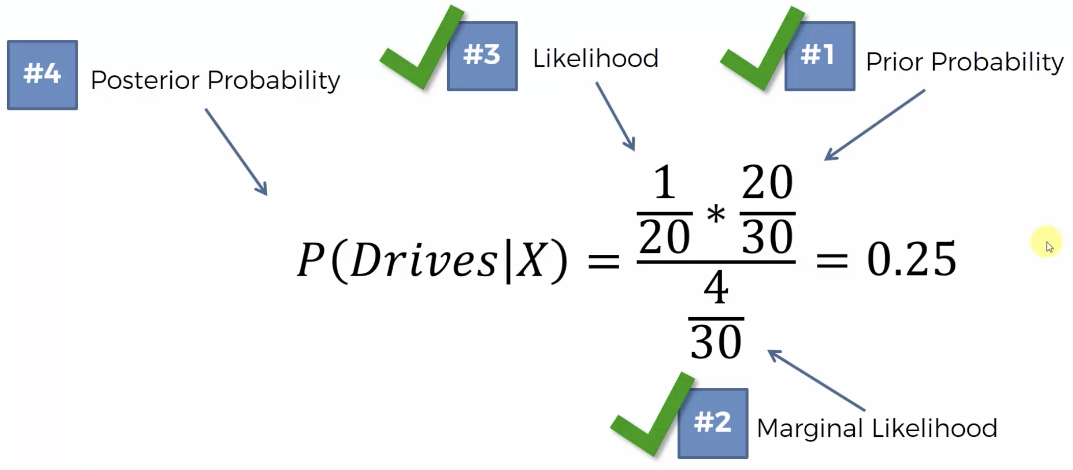 The probability of somebody who exhibits features X being a person who drives to work is 25%.