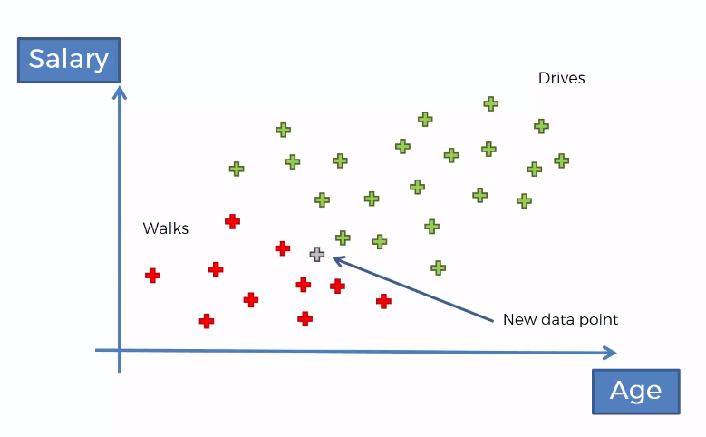 Anybody that falls in that circle again is it's not a square it's a square is a circle. Anybody who falls somewhere is somewhere in that vicinity is going to be deemed similar to the new data point that we're adding to our data set.