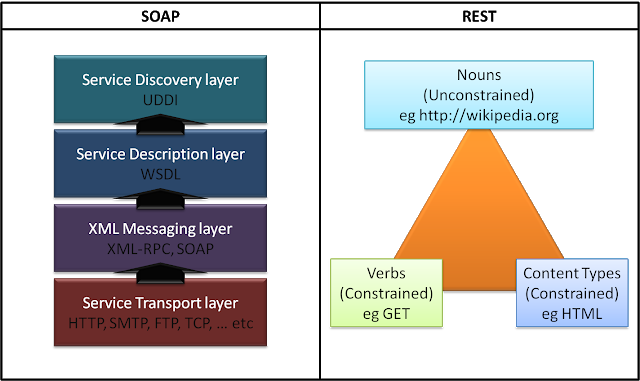 Security Support both SSL security and WS-security, which adds some enterprise security features. Supports identity through intermediaries, not just point to point SSL. Supports only point-to-point SSL security ACID Having comprehensive support for both ACID based transaction management for short-lived transactions and compensation based transaction management for long-running transactions. It also supports two-phase commit across distributed resources. REST supports transactions, but it is neither ACID compliant nor can provide two-phase commit across distributed transactional resources as it is limited by its HTTP protocol. Used When - SOAP used when clients need to have access to objects available on servers