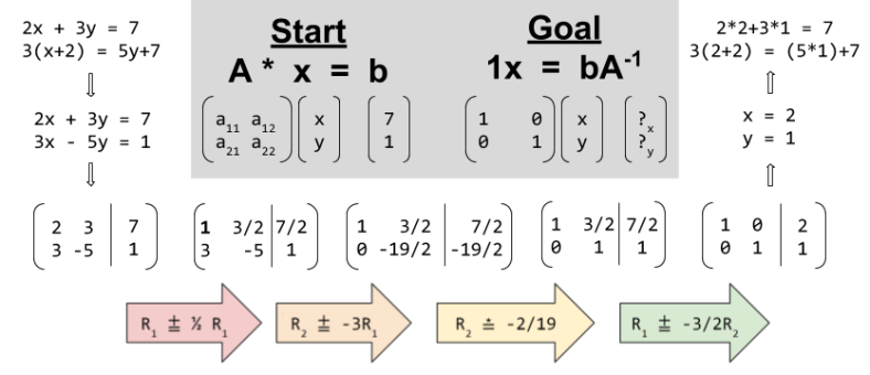After creating a matrix of the form $Ax=b$, we can solve for x be creating an augmented matrix of the for $\left [ A\: |\: b \right ]$, and converting the left-hand side into the identity matrix: