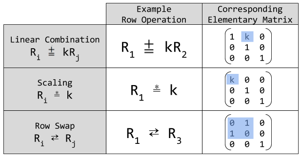 - Linear Combination: $R_{i}$ += $kR_{j}$