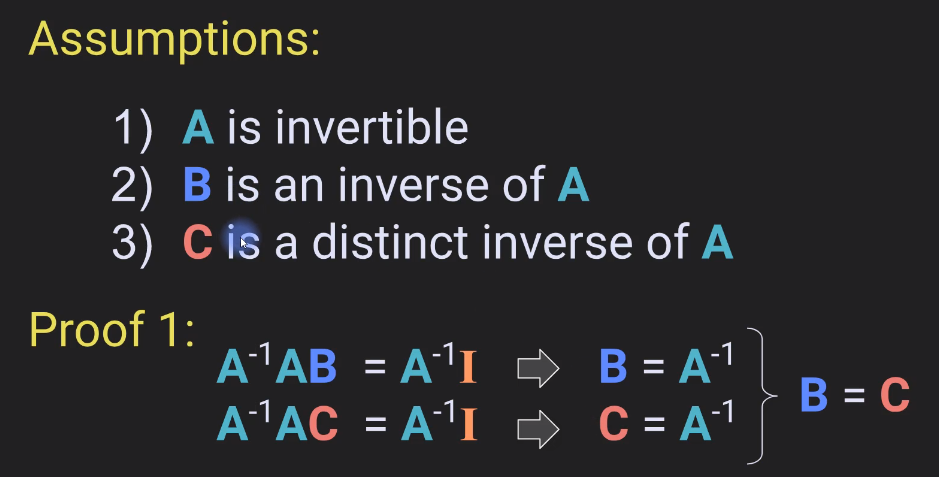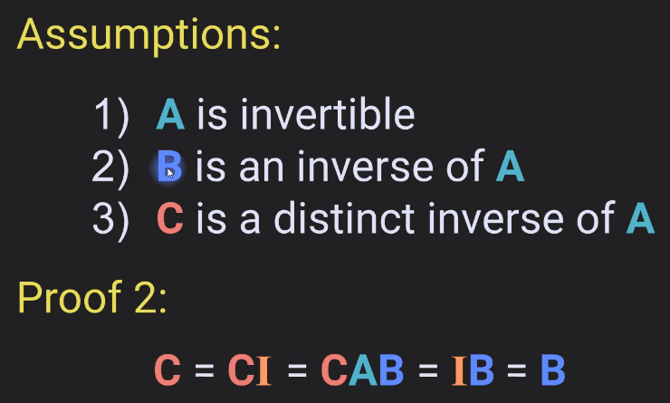 - The matrix A has a left inverse (that is, there exists a B such that BA = I) or a right inverse (that is, there exists a C such that AC = I), in which case both left and right inverses exist and B = C = $A^{-1}$.