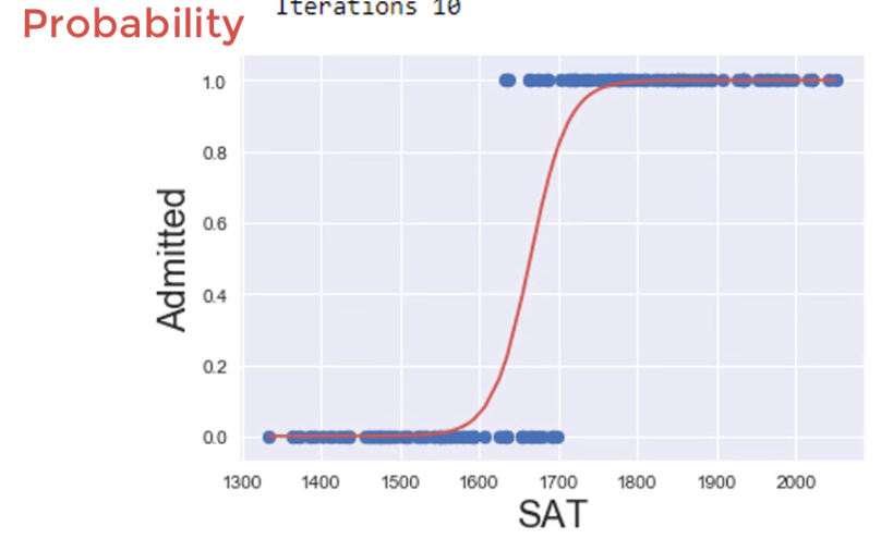 When the score is relatively low. The probability of getting admitted is zero when the score is relatively high. When the score is relatively high, the probability of getting admitted is 1 or 100% a score in between 1600 and 1750 is uncertain. We would call this curve a logistic regression curve.