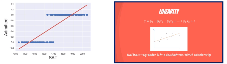 Not only is this linear regression an awful fit but it also predicts values which are consist of only 0 and 1 which fall outside the natural domain of admission. This regression doesn't even know that our values are bounded between 0 and 1. The first assumption of the OLS was linearity and it has violated our data is non-linear. Thus we must use non-linear approaches.