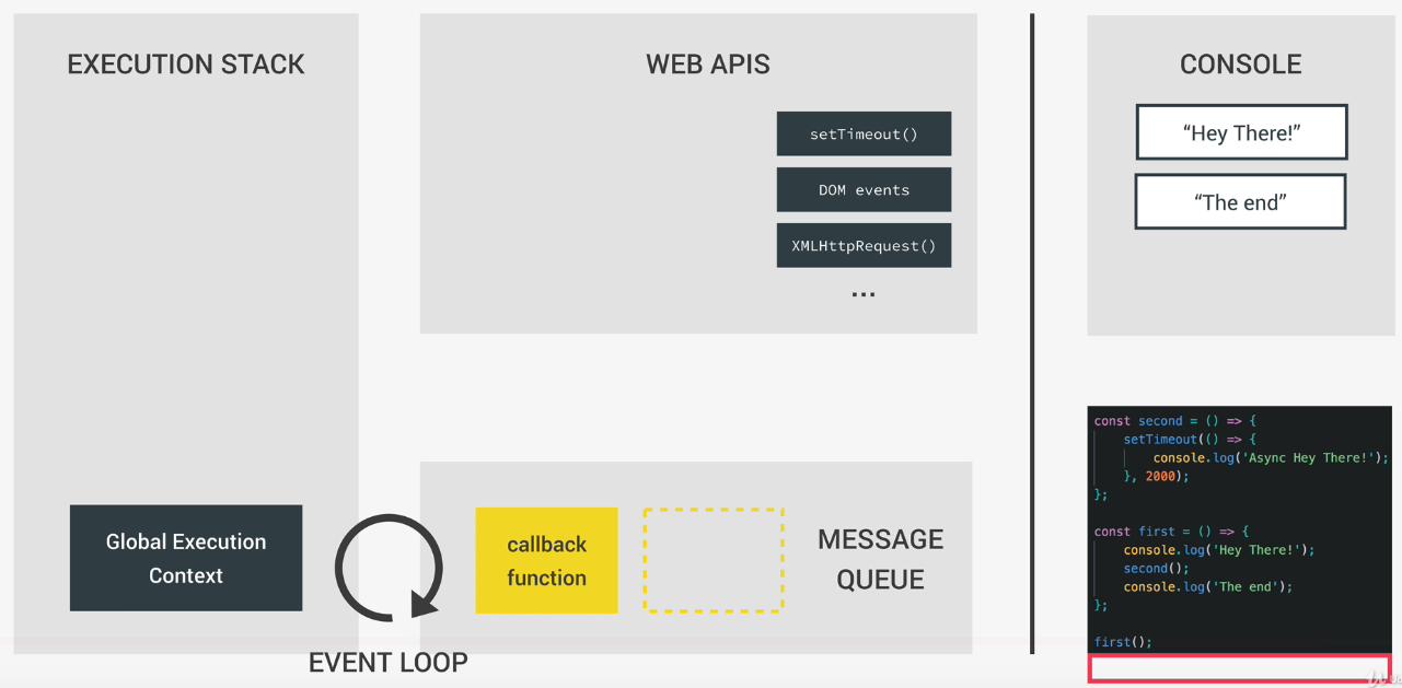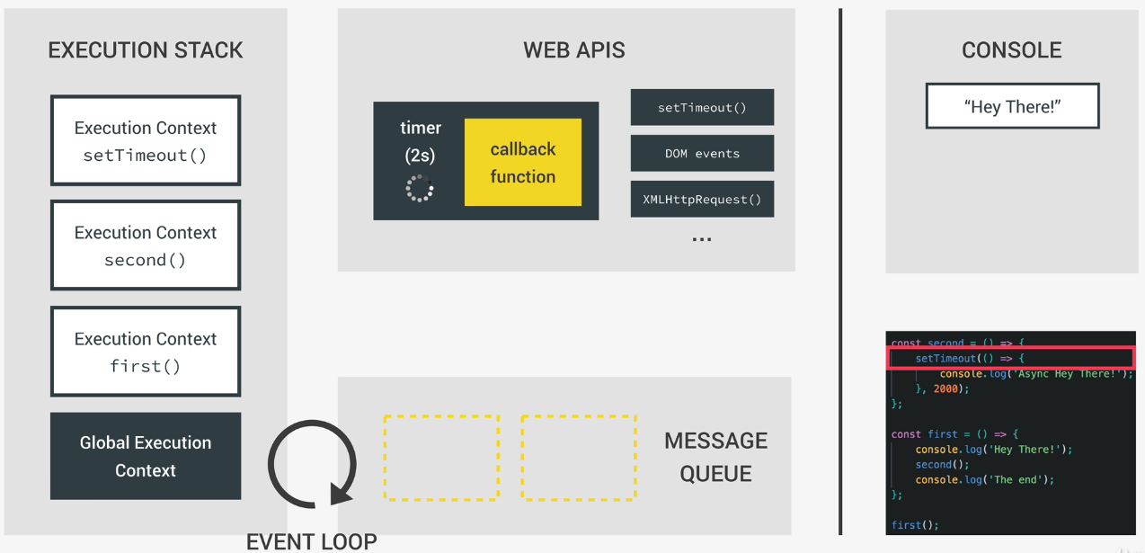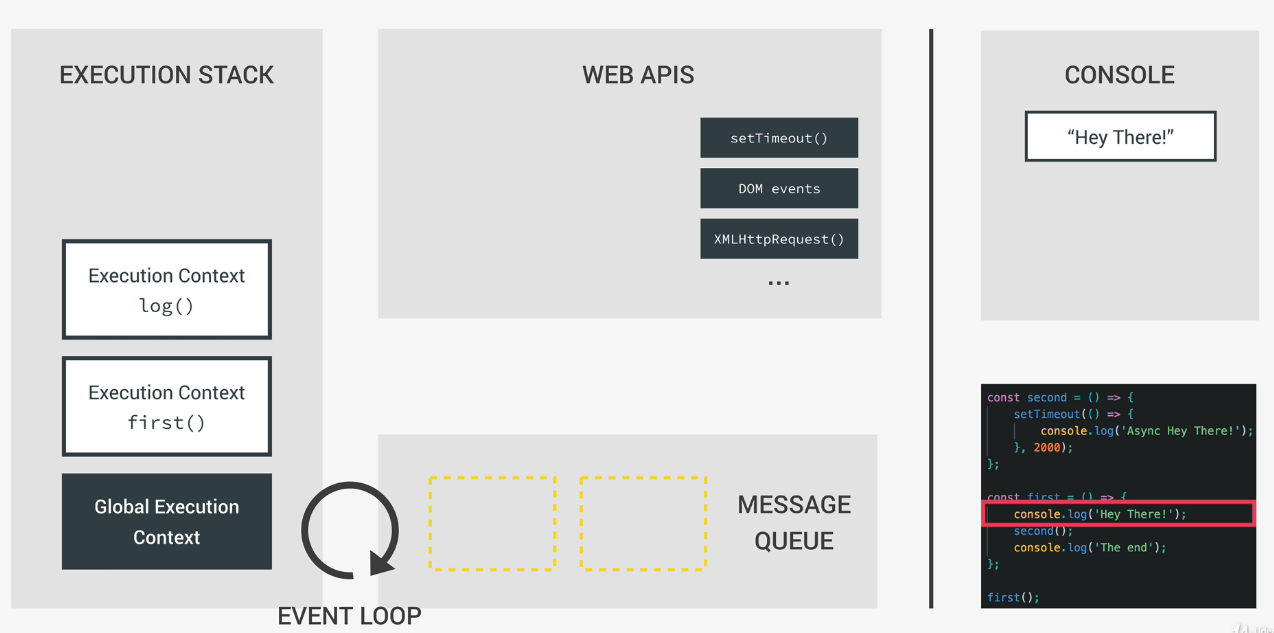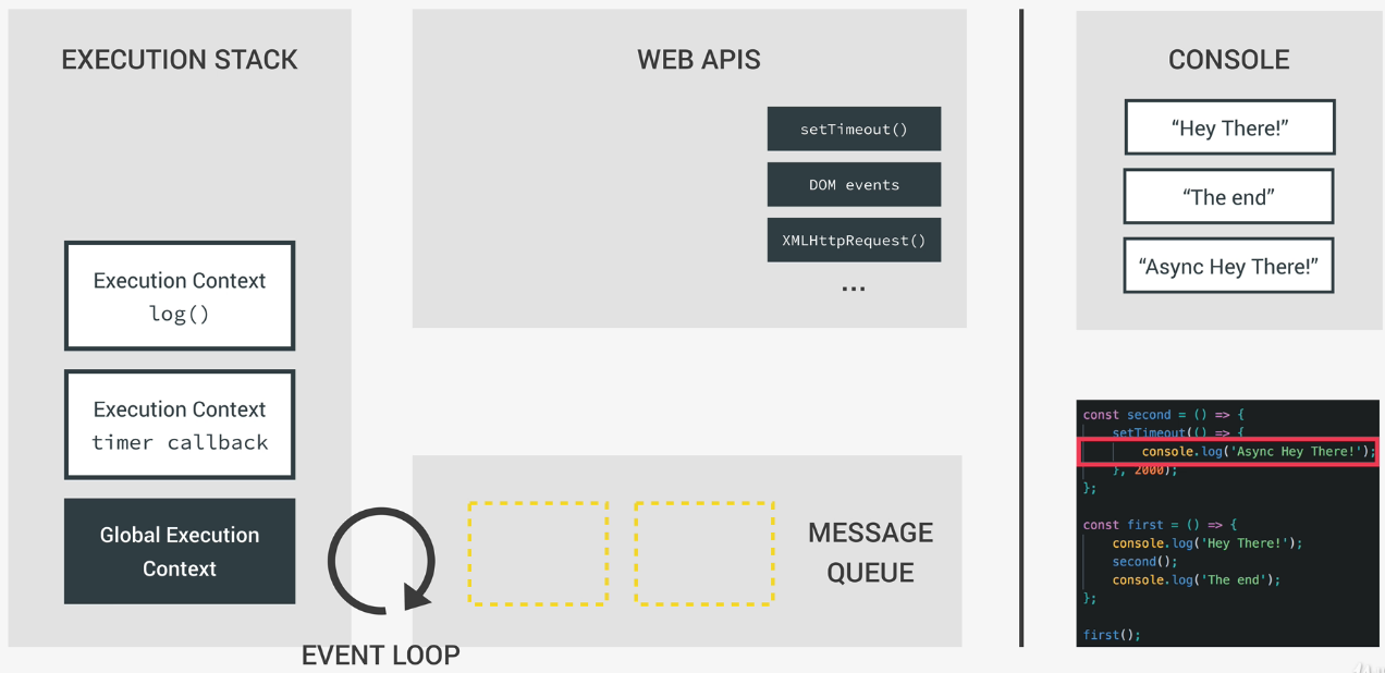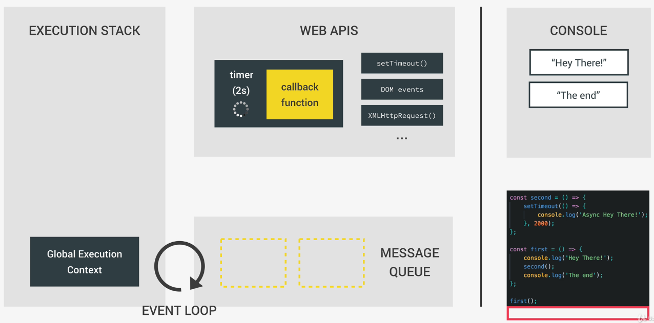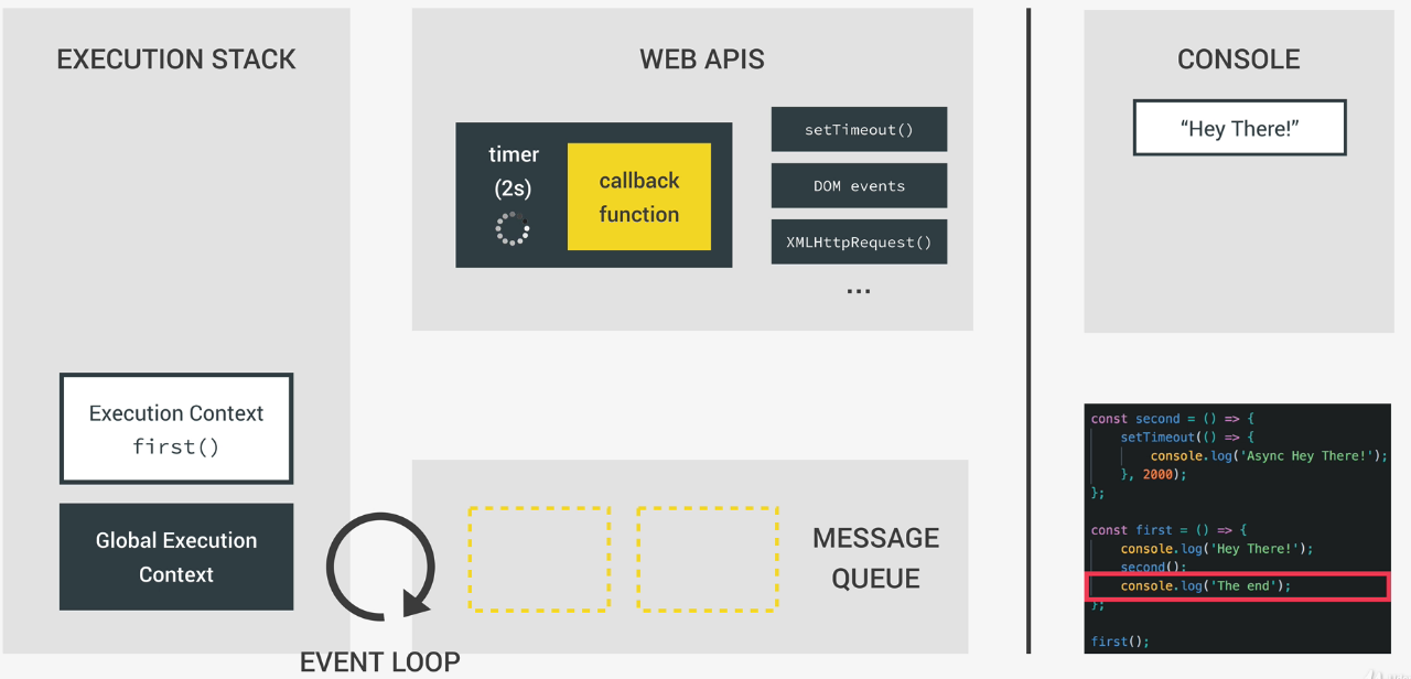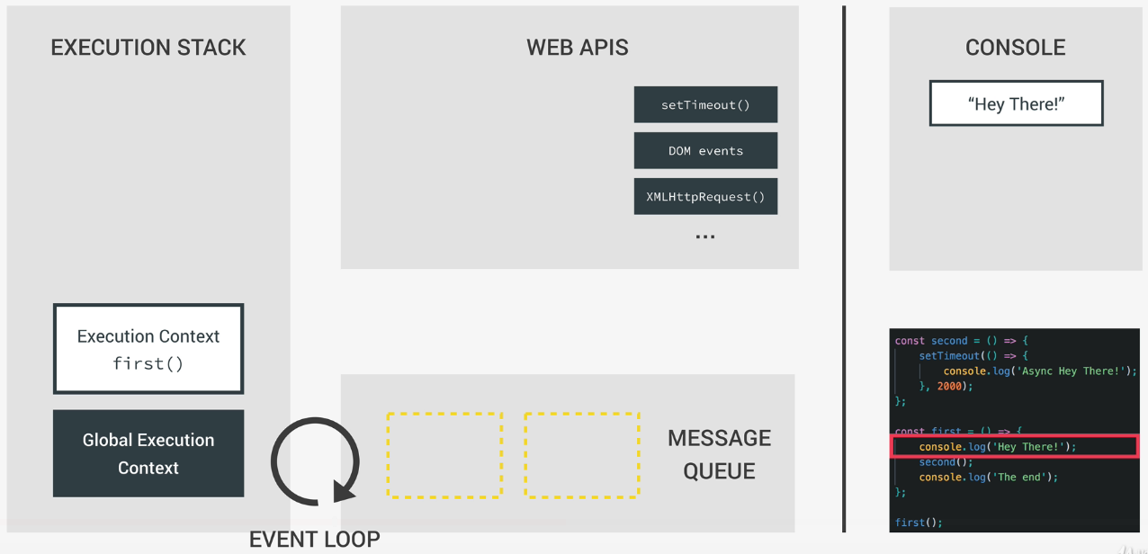 const second = () => { setTimeout(() => { console.log('Async Hey there'); }, 2000); } const first = () => { console.log('Hey there'); second(); console.log('The end'); }3.1 console.log('Hey there');