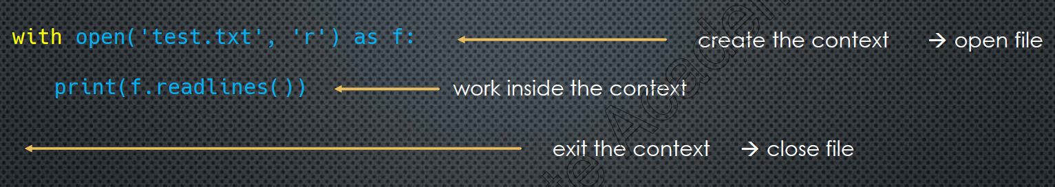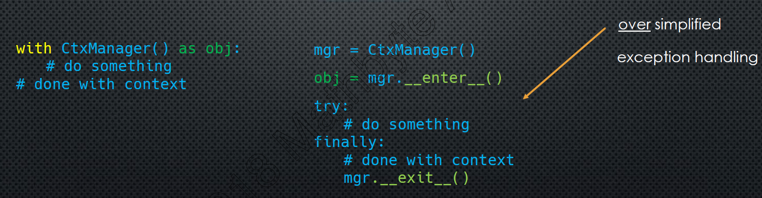 class MyClass: def __init__(self): #init class def __enter__(self): return obj def __exit__(self, + ...): #clean up obj # works as a regular class __enter__, __exit__ were not called my_obj = MyClass() with MyClass() as obj: # creates an instance of of Myclass # no associated symbol, but an instance exits # my_instance # calls my_instance.__enter__() # return value from __enter__ is assigned to obj(not the instance of MyClass that was created) # after the with block, or if an exception occurs inside the with block # my_instance.__exit__ is called3.2.1 Scope of with block