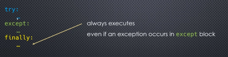 The final section of a try always executes even if a function and return are in the try or except blocks. It is very useful for writing code that should execute no matter what happens. But this can get cumbersome.