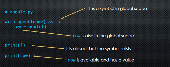 f = open('test.txt', 'r') print(f.readlines()) f.close()when print(f.readlines()) runs, it has a context in which it runs global scope.