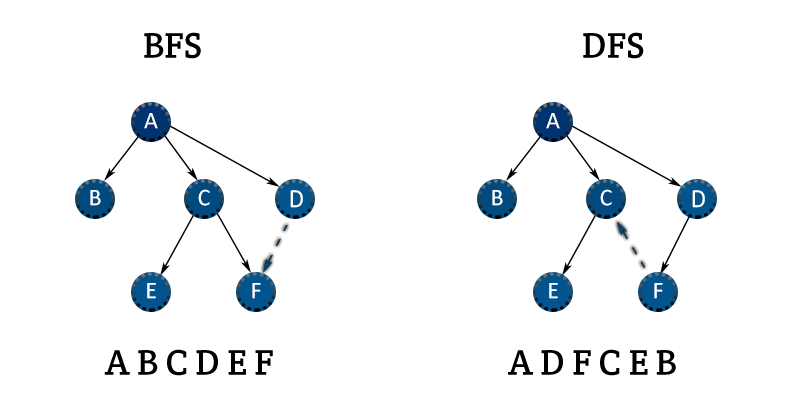 - For implementation, BFS uses a queue data structure, while DFS uses a stack.