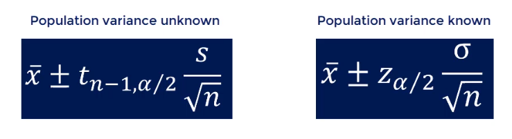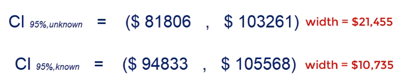 You can clearly note that when we know the population variance we get a narrower confidence interval when we do not know the population variance. There is a higher uncertainty that is reflected by wider boundaries for our interval.