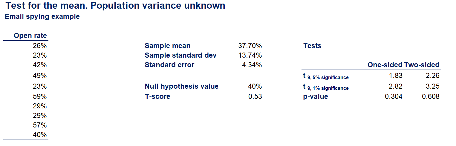 - $$T=\frac{\bar{x}-\mu}{\frac{s}{\sqrt{n}}}T=\frac{\bar{x}-\mu}{\frac{s}{\sqrt{n}}}=\frac{37.70%-40%}{4.34%}=-0.53$$
