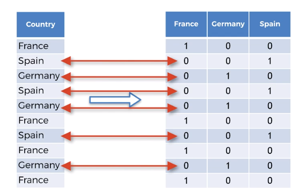 the problem is still the same machine learning models are based on equations and that's good that we replaced the text by numbers so that we can include the numbers in the equations. However since one is greater than zero and two is greater than one the equations in the model will think that Spain has a higher value than Germany and France and Germany has a higher value than France. And that's not the case. These are actually three categories and there is no relational order between the three. We cannot compare France Spain and Germany by saying that Spain is greater than Germany or Germany is greater than France. This wouldn't make any sense if we had for example the variable size with the size like small medium and large then yes we could express orders between the values of this variable because large is greater than medium and medium is greater than smo. There he doesn't make any sense. So we have to prevent the machine learning equations from thinking that Germany is greater than France