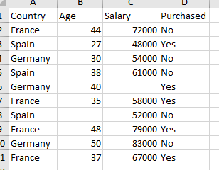 Let's explain what its features scaling and why we need to do it. So as you can see we have these two columns age and salary that contain numerical numbers. Let's just focus on the age and the salary. You notice that the variables are not on the same scale because the age is going from 27 to 50. And the salaries going from 40K to like 90K. So because this age variable in the salary variable doesn't have the same scale. This will cause some issues in your machine learning models. It's because your machine models a lot of machine learning models are based on what is called the Euclidean distance.