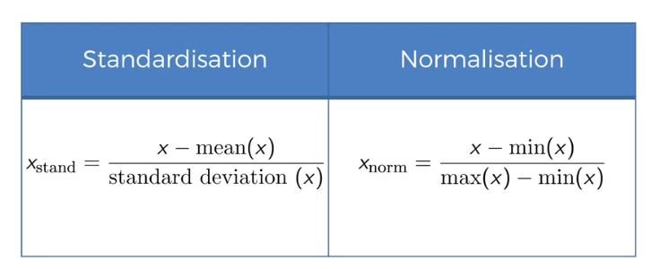 A very common one is standardization which means that for each observation and each feature you withdraw the mean value of all the values of the feature and you divide it by the standard deviation. So that's the first type of features gaining and another type is normalization which means that you subtract your observation feature X by the minimum value of all the future values and you divide it by the difference between the maximum of your future values and the minimum of your future values. what you need to understand is that we are putting our variables in the same range on the same scale so that no variable is dominated by the other.