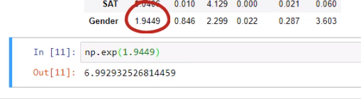 The new coefficient of gender is 1.94. The exponential of 1.94 is around 7. The interpretation is the following. Given the same S.A.T. score, a female is seven times more likely to be admitted than a male.