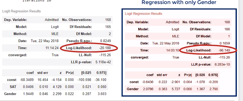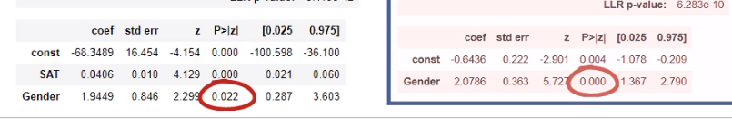 What we get is a regression that has a much higher log-likelihood meaning it is a better one and it makes sense. SAT was an outstanding predicter we can see that the gender variable is significant but we no longer have those 0.000
