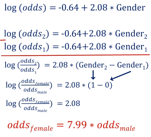 If we take the exponential of both sides we get that the odds of a female to get admitted are 7.99 times higher than those of a male. That's the interpretation of binary predictors coefficients.