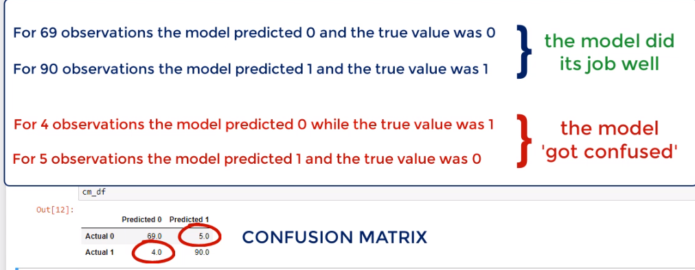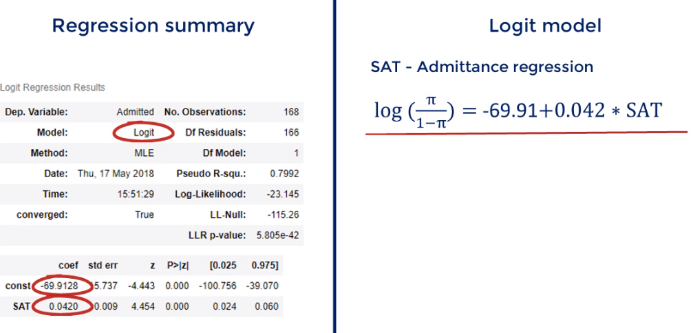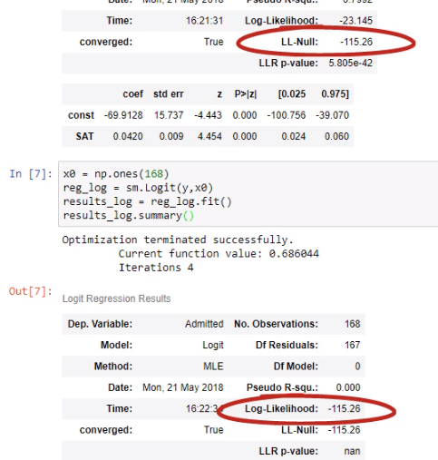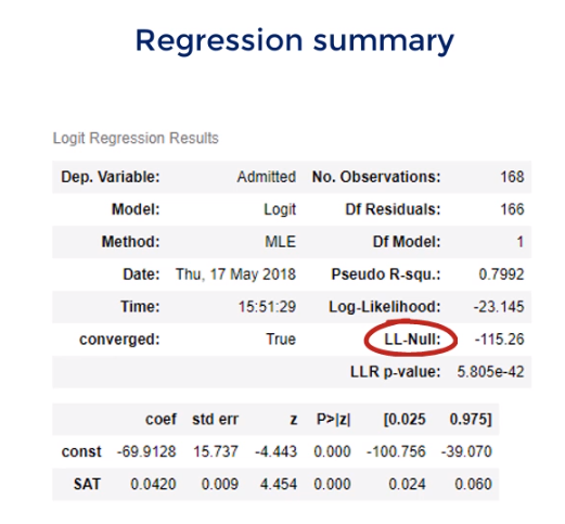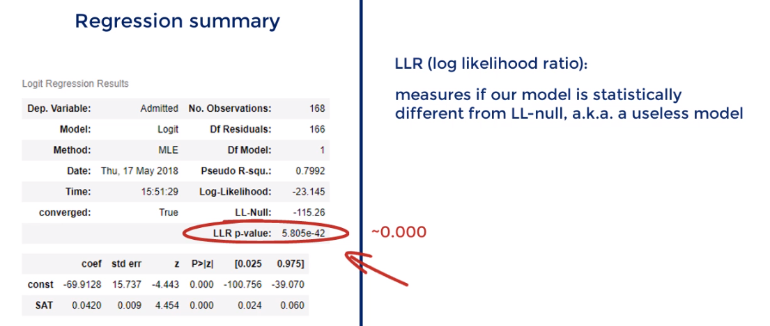 If we create a logistic regression based on it it will have a log-likelihood equal to the LL-NulL of the previous model. You may want to compare the log-likelihood of your model with the ll-null to see if your model has any explanatory power. Seeing if our model is significant. There was this F-test for the linear regression. There must be one for logistic regression, too. It is called the log-likelihood ratio test or LLR or it is based on the log-likelihood of the model and the LLNL measures if our model is statistically different from the L-L now aka a useless model. We have it's P-value and that's all we need as we can see it is very low around 0.000