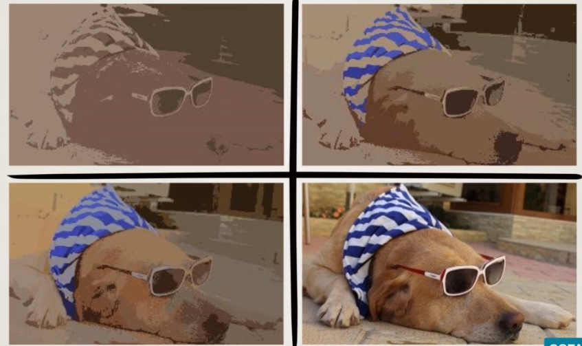 In the third photo 30, Although it seems like a small improvement there are three times more colors than in the second one and we can already see details like an ear and different colors of the fir.