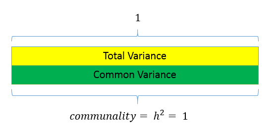 Unlike factor analysis, principal components analysis or PCA makes the assumption that there is no unique variance, the total variance is equal to the common variance. Recall that variance can be partitioned into a common and unique variance. If there is no unique variance then common variance takes up total variance (see figure below). Additionally, if the total variance is 1, then the common variance is equal to the communality.