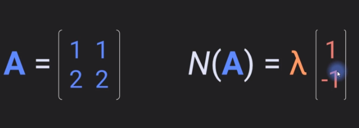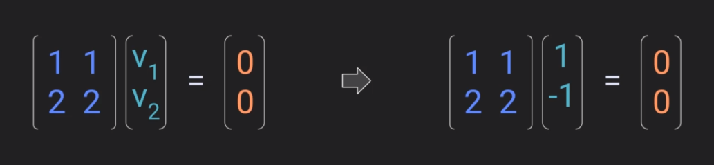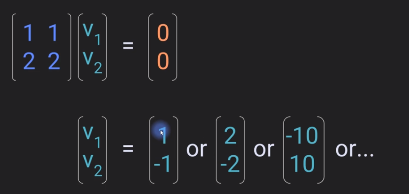 Some vector of coefficients V1 and V2 such that the linear weighted combination of the columns in this matrix gives us the zero vector without the vector coefficients themselves all being equal to zero. In this case, this matrix has null space