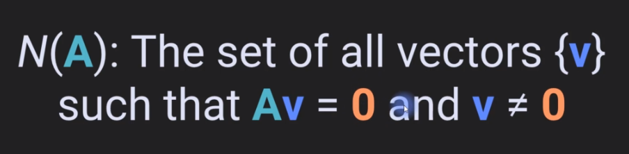 the null space of a matrix is the set of all vectors that you can multiply by a matrix to make this equation true. Where this zero, this is a bolded zero, so this is the zero vector, excluding the case the trivial case where the vector is simply the zeros vector itself.