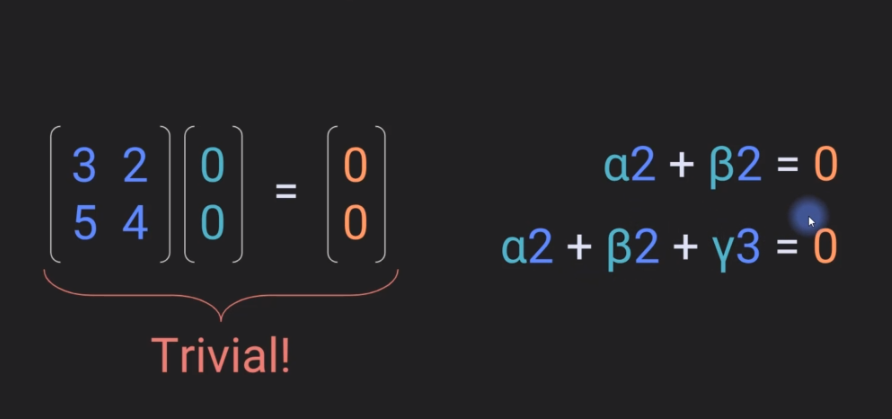 Matrix times some coefficients vector produces the zero vector. Only the trivial case's matrix does not have a null space or the null space is empty.