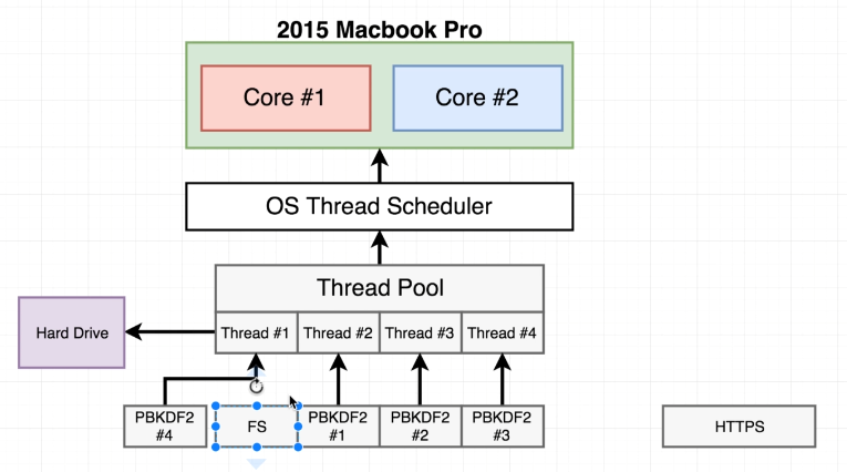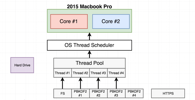 // Assume thread pool size is 4 const https = require('https') const crypto = require('crypto') const fs = require('fs') const start = Date.now() function doRequest() { https.request('https://www.google.com', res => { res.on('data', () => { }); res.on('end', () => { console.log(Date.now() - start); }); }).end(); } function doHash() { crypto.pbkdf2('a', 'b', 100000, 512, 'sha512', () => { console.log('Hash:', Date.now() - start); }); } doRequest() fs.readFile('multitask.js', 'utf8', () => { console.log('FS: ', Date.now() - start); }); doHash() doHash() doHash() doHash() // output 433 Hash: 586 FS: 587 Hash: 618 Hash: 626 Hash: 715