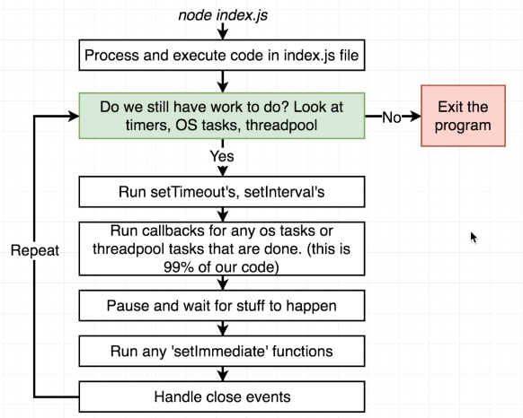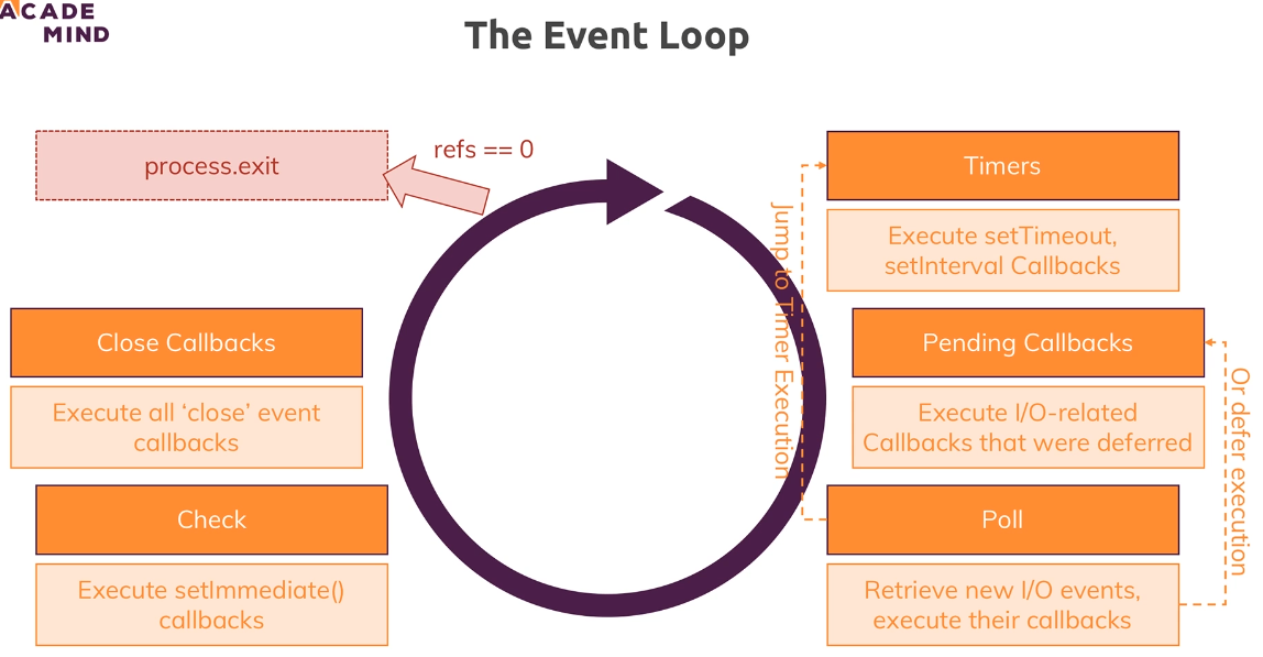 So roughly spoken, we have timer callbacks, we then have any IO related callbacks and other event callbacks and setImmediate followed by close event callbacks