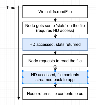 If we had written or read a file, we might have a callback because that operation finished and it will then also execute these callbacks.