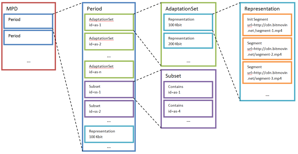 In order to describe the temporal and structural relationships between segments, MPEG-DASH introduced the so-called Media Presentation Description (MPD). The MPD is an XML file that represents the different qualities of the media content and the individual segments of each quality with HTTP Uniform Resource Locators (URLs). This structure provides the binding of the segments to the bitrate (resolution, etc.) among others (e.g., start time, duration of segments). As a consequence, each client will first request the MPD that contains the temporal and structural information for the media content and based on that information it will request the individual segments that fit best for its requirements.