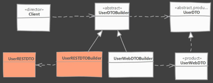 class Address { private String houseNumber; private String street; private String city; private String zipcode; private String state; public String getHouseNumber() { return houseNumber; } public void setHouseNumber(String houseNumber) { this.houseNumber = houseNumber; } public String getStreet() { return street; } public void setStreet(String street) { this.street = street; } public String getCity() { return city; } public void setCity(String city) { this.city = city; } public String getZipcode() { return zipcode; } public void setZipcode(String zipcode) { this.zipcode = zipcode; } public String getState() { return state; } public void setState(String state) { this.state = state; } } class User { private String firstName; private String lastName; private LocalDate birthday; private Address address; public String getFirstName() { return firstName; } public void setFirstName(String firstName) { this.firstName = firstName; } public String getLastName() { return lastName; } public void setLastName(String lastName) { this.lastName = lastName; } public LocalDate getBirthday() { return birthday; } public void setBirthday(LocalDate birthday) { this.birthday = birthday; } public Address getAddress() { return address; } public void setAddress(Address address) { this.address = address; } } interface UserDTO { String getName(); String getAddress(); String getAge(); } class UserWebDTO implements UserDTO { private String name; private String address; private String age; public UserWebDTO(String name, String address, String age) { this.name = name; this.address = address; this.age = age; } public String getName() { return name; } public String getAddress() { return address; } public String getAge() { return age; } @Override public String toString() { return "name=" + name + "\nage=" +age+"\naddress=" +address; } } interface UserDTOBuilder { UserDTOBuilder withFirstName(String fname); UserDTOBuilder withLastName(String lname); UserDTOBuilder withBirthday(LocalDate date); UserDTOBuilder withAddress(Address address); UserDTO build(); UserDTO getUserDTO(); } class UserWebDTOBuilder implements UserDTOBuilder { private String firstName; private String lastName; private String age; private String address; private UserWebDTO dto; @Override public UserDTOBuilder withFirstName(String fname) { firstName = fname; return this; } @Override public UserDTOBuilder withLastName(String lname) { lastName = lname; return this; } @Override public UserDTOBuilder withBirthday(LocalDate date) { Period ageInYears = Period.between(date, LocalDate.now()); age = Integer.toString(ageInYears.getYears()); return this; } @Override public UserDTOBuilder withAddress(Address address) { this.address = address.getHouseNumber() + ", " + address.getStreet() + "\n" + address.getCity() + "\n" + address.getState() + " " + address.getZipcode(); return this; } @Override public UserDTO build() { dto = new UserWebDTO(firstName + " " + lastName, address, age); return dto; } @Override public UserDTO getUserDTO() { return dto; } } public class Client { public static void main(String[] args) { User user = createUser(); UserDTOBuilder builder = new UserWebDTOBuilder(); UserDTO dto = directBuild(builder, user); System.out.println(dto); } // Director using the builder and the user entity in order to create our entity. private static UserDTO directBuild(UserDTOBuilder builder, User user) { return builder.withFirstName(user.getFirstName()).withLastName(user.getLastName()) .withAddress(user.getAddress()) .withBirthday(user.getBirthday()) .build(); } public static User createUser() { User user = new User(); user.setBirthday(LocalDate.of(1960, 5, 6)); user.setFirstName("Ron"); user.setLastName("Swanson"); Address address = new Address(); address.setHouseNumber("100"); address.setStreet("State Street"); address.setCity("Pawnee"); address.setState("Indiana"); address.setZipcode("47998"); user.setAddress(address); return user; } }4.2 Case 2