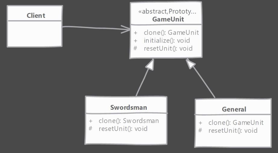abstract class GameUnit implements Cloneable { private Point3D position; public GameUnit() { position = Point3D.ZERO; } @Override public GameUnit clone() throws CloneNotSupportedException { GameUnit unit = (GameUnit)super.clone(); unit.initialize(); return unit; } protected void initialize() { this.position = Point3D.ZERO; reset(); } protected abstract void reset(); public GameUnit(float x, float y, float z) { position = new Point3D(x, y, z); } public void move(Point3D direction, float distance) { Point3D finalMove = direction.normalize(); finalMove = finalMove.multiply(distance); position = position.add(finalMove); } public Point3D getPosition() { return position; } } class General extends GameUnit{ private String state = "idle"; public void boostMorale() { this.state = "MoralBoost"; } @Override public String toString() { return "General "+state+" @ "+getPosition(); } @Override public GameUnit clone() throws CloneNotSupportedException { throw new CloneNotSupportedException("Ganerals are unique"); } @Override protected void reset() { throw new UnsupportedOperationException("Reset not supported"); } } class Swordsman extends GameUnit { private String state = "idle"; public void attack() { this.state = "attacking"; } @Override public String toString() { return "Swordsman "+state+" @ "+getPosition(); } @Override protected void reset() { state = "idle"; } } public class Client { public static void main(String[] args) throws CloneNotSupportedException { Swordsman s1 = new Swordsman(); s1.move(new Point3D(-10,0,0), 20); s1.attack(); Swordsman s2 = (Swordsman)s1.clone(); System.out.println(s1); System.out.println("Cloned swordsman"+s2); } }6. Reference