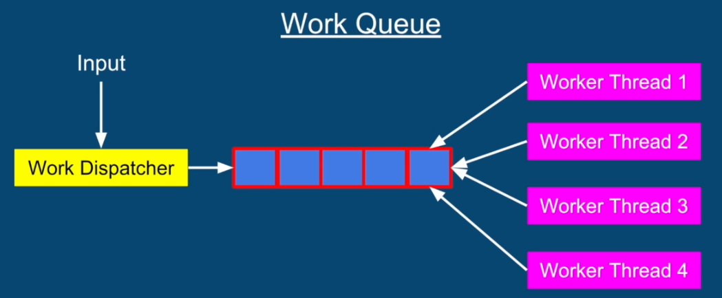 Having one thread called the dispatcher thread that takes work as input either directly from the user or through HTTP requests. If it's a web server for example and distributes the work among a small number of dedicated worker threads using a shared queue, the worker threads are waiting for the work to arrive through that queue and grab the task from it as soon as they finish their current task that queue here is obviously backed by a data structure stored on the heap and is a shared resource this leads to very efficient CPU utilization and low latency. As we don't need to recreate a new thread every single time we have a new task so high performance is a clear benefit in this case