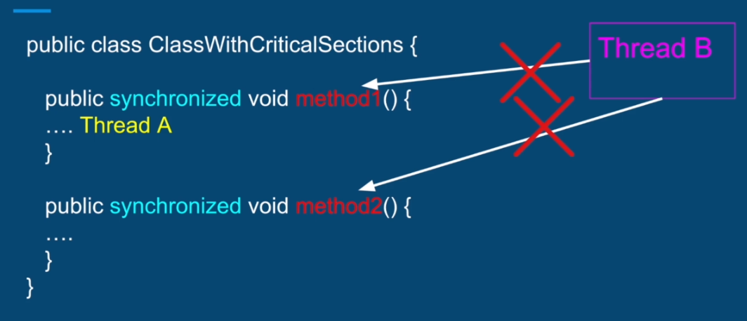 public static void main(String [] args) { SharedClass sharedObject = new SharedClass(); Thread thread1 = new Thread(() -> { while (true) { sharedObject.increment(); } }); Thread thread2 = new Thread(() -> { while (true) { sharedObject.decrement(); } }); thread1.start(); thread2.start(); } private static class SharedClass { private int counter = 0; public synchronized void increment() { this.counter++; } public synchronized void decrement() { this.counter--; } }When thread1 is executing sharedObject.increment(), thread2 cannot execute sharedObject.decrement(). And when thread2 is executing sharedObject.decrement(), thread1 cannot execute sharedObject.increment(). That's because both methods are synchronized, and belong to the same object.