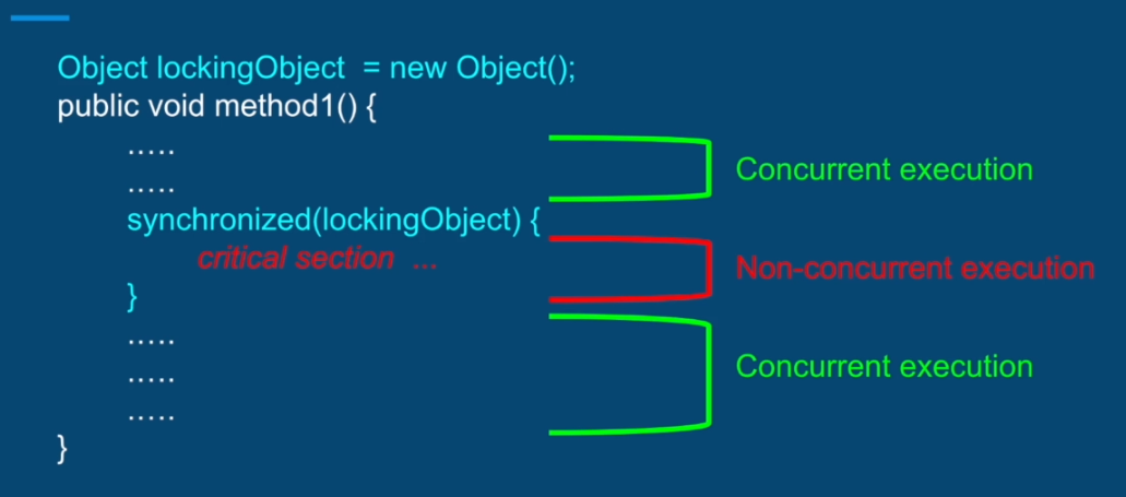public static void main(String [] args) { SharedClass sharedObject = new SharedClass(); Thread thread1 = new Thread(() -> { while (true) { sharedObject.incrementCounter1(); } }); Thread thread2 = new Thread(() -> { while (true) { sharedObject.incrementCounter2(); } }); thread1.start(); thread2.start(); } private static class SharedClass { private int counter1 = 0; private int counter2 = 0; private Object lock1 = new Object(); private Object lock2 = new Object(); public void incrementCounter1() { synchronized (lock1) { this.counter1++; } } public void incrementCounter2() { synchronized (lock2) { this.counter2++; } } }When thread1 is executing sharedObject.incrementCounter1(), thread2 can execute sharedObject.incrementCounter2(). That's because of the synchronized blocks inside those methods, synchronized on different lock objects.