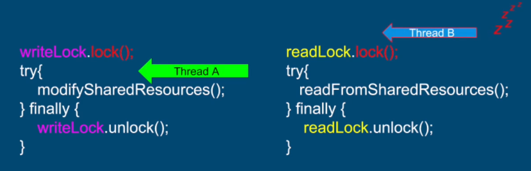 ReentrantReadWriteLock rwLock = new ReentrantReadWriteLock(); Lock readLock = rwLock.readLock(); Lock writeLock = rwLock.writeLock(); writeLock.lock(); try { modifySharedResource(); } finally { writeLock.unlock(); } readLock.lock(); try { readFromSharedResource(); } finally{ readLock.unlock(); }2.4 Mutual exclusion between readers and writers