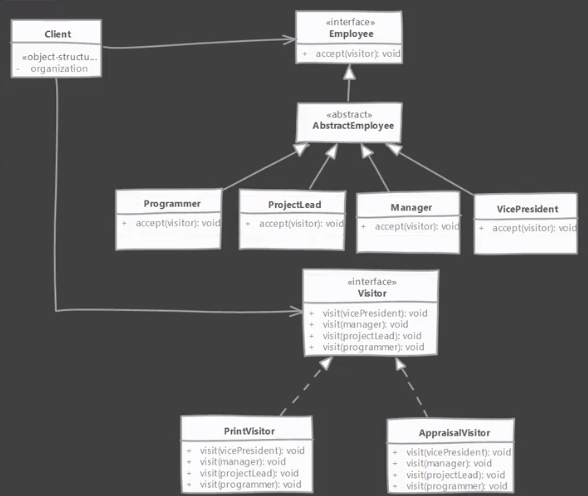 interface Employee { int getPerformanceRating(); void setPerformanceRating(int rating); Collection<Employee> getDirectReports(); int getEmployeeId(); void accept(Visitor visitor); } interface Visitor { void visit(Programmer programmer); void visit(ProjectLead lead); void visit(Manager manager); void visit(VicePresident vp); } abstract class AbstractEmployee implements Employee { private int performanceRating; private String name; private static int employeeIdCounter = 101; private int employeeId; public AbstractEmployee(String name) { this.name = name; employeeId = employeeIdCounter++; } public String getName() { return name; } @Override public int getPerformanceRating() { return performanceRating; } @Override public void setPerformanceRating(int rating) { performanceRating = rating; } @Override public Collection<Employee> getDirectReports() { return Collections.emptyList(); } @Override public int getEmployeeId() { return employeeId; } } class PerformanceRating { private int id; private int personalRating; private int teamAverageRating; private int finalRating; public PerformanceRating(int id, int personalRating) { this.id = id; this.personalRating = personalRating; } public int getId() { return id; } public int getPersonalRating() { return personalRating; } public int getTeamAverageRating() { return teamAverageRating; } public int getFinalRating() { return finalRating; } public void setTeamAverageRating(int teamAverageRating) { this.teamAverageRating = teamAverageRating; } public void setFinalRating(int finalRating) { this.finalRating = finalRating; } } class PrintVisitor implements Visitor { @Override public void visit(Programmer programmer) { String msg = programmer.getName() + " is a " + programmer.getSkill() + " programmer."; System.out.println(msg); } @Override public void visit(ProjectLead lead) { String msg = lead.getName() + " is a Project Lead with " + lead.getDirectReports().size() + " programmers reporting."; System.out.println(msg); } @Override public void visit(Manager manager) { String msg = manager.getName() + " is a Manager with " + manager.getDirectReports().size() + " leads reporting."; System.out.println(msg); } @Override public void visit(VicePresident vp) { String msg = vp.getName() + " is a Vice President with " + vp.getDirectReports().size() + " managers reporting."; System.out.println(msg); } } class Manager extends AbstractEmployee { private List<Employee> directReports = new ArrayList<>(); public Manager(String name,Employee...employees) { super(name); Arrays.stream(employees).forEach(directReports::add); } @Override public Collection<Employee> getDirectReports() { return directReports; } @Override public void accept(Visitor visitor) { visitor.visit(this); } } class Programmer extends AbstractEmployee { private String skill; public Programmer(String name, String skill) { super(name); this.skill = skill; } public String getSkill() { return skill; } @Override public void accept(Visitor visitor) { visitor.visit(this); } } class ProjectLead extends AbstractEmployee { private List<Employee> directReports = new ArrayList<>(); public ProjectLead(String name, Employee...employees) { super(name); Arrays.stream(employees).forEach(directReports::add); } @Override public Collection<Employee> getDirectReports() { return directReports; } @Override public void accept(Visitor visitor) { visitor.visit(this); } } class VicePresident extends AbstractEmployee{ private List<Employee> directReports = new ArrayList<>(); public VicePresident(String name, Employee...employees) { super(name); Arrays.stream(employees).forEach(directReports::add); } @Override public Collection<Employee> getDirectReports() { return directReports; } @Override public void accept(Visitor visitor) { visitor.visit(this); } } class AppraisalVisitor implements Visitor{ private Ratings ratings = new Ratings(); @SuppressWarnings("serial") public class Ratings extends HashMap<Integer, PerformanceRating>{ public int getFinalRating(int empId) { return get(empId).getFinalRating(); } } @Override public void visit(Programmer programmer) { PerformanceRating finalRating = new PerformanceRating(programmer.getEmployeeId(), programmer.getPerformanceRating()); finalRating.setFinalRating(programmer.getPerformanceRating()); ratings.put(programmer.getEmployeeId(), finalRating); } @Override public void visit(ProjectLead lead) { //25% team & 75% personal PerformanceRating finalRating = new PerformanceRating(lead.getEmployeeId(), lead.getPerformanceRating()); int teamAverage = getTeamAverage(lead); int rating = Math.round(0.75f * lead.getPerformanceRating() + 0.25f*teamAverage); finalRating.setFinalRating(rating); finalRating.setTeamAverageRating(teamAverage); ratings.put(lead.getEmployeeId(), finalRating); } @Override public void visit(Manager manager) { //50% team & 50% personal PerformanceRating finalRating = new PerformanceRating(manager.getEmployeeId(), manager.getPerformanceRating()); int teamAverage = getTeamAverage(manager); int rating = Math.round(0.5f * manager.getPerformanceRating() + 0.5f*teamAverage); finalRating.setFinalRating(rating); finalRating.setTeamAverageRating(teamAverage); ratings.put(manager.getEmployeeId(), finalRating); } @Override public void visit(VicePresident vp) { //75% team & 25% personal PerformanceRating finalRating = new PerformanceRating(vp.getEmployeeId(), vp.getPerformanceRating()); int teamAverage = getTeamAverage(vp); int rating = Math.round(0.25f * vp.getPerformanceRating() + 0.75f*teamAverage); finalRating.setFinalRating(rating); finalRating.setTeamAverageRating(teamAverage); ratings.put(vp.getEmployeeId(), finalRating); } private int getTeamAverage(Employee emp) { return (int)Math.round(emp.getDirectReports().stream().mapToDouble(e->e.getPerformanceRating()).average().getAsDouble()); } public Ratings getFinalRatings() { return ratings; } } public class Client { public static void main(String[] args) { Employee emps = buildOrganization(); Visitor visitor = new PrintVisitor(); visitOrgStructu